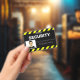 This custom photo identification badge features a sample photograph on the left with the company name or other text, and employee name to the right. The title "SECURITY" is printed above it in bold white font over a black background. You can include your company name or additional text below the image, as well as an employee name.