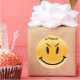 a round sticker with a big smiley face on it and it says smile across the top in sweets.