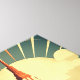 With its flattened perspective, simplified forms, and vibrant palette of burnt oranges, muted golds, and cool blues, the artwork channels the optimism of Art Deco and the grandeur of WPA-era futurism. Stylised clouds drift past, grounding the idealism in a dreamlike realism.