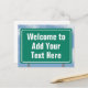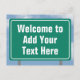 Green highway sign with Welcome to and your business name or any text. Blue sky background for a fun message or for business marketing.