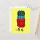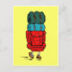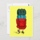 This postcard shows the cartoon character of a backpacker with an enormous backpack. The design is colourful and bright. You can add text to the design using the customisation options available.