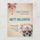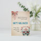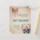 Send spooky season greetings with a wink and a flourish. This vintage-style Halloween card features a beautifully distressed background that evokes aged parchment, paired with ornate floral chandelier motifs and a richly detailed sugar skull illustration in shades of red, teal, and pink. The design blends Dia de los Muertos elegance with a touch of gothic glam, making it perfect for those who love their Halloween with personality and polish.