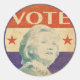 Round sticker with Hillary Clinton print in distressed vintage style for presidential election in 2016. Round button style sticker with Hillary Clinton in centre telling you to vote.