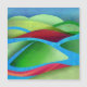 An abstract landscape with vibrant colours and textures showing hills floating on ice in shades of green, blue, cyan, red, and pink.