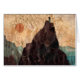 This note card features a collage rendition of a small figure sitting on a mountain top pondering the nature of the universe as an orange sun rises in the pale salmon coloured sky. More hills are in the distance as well as turquoise blue ocean.