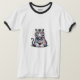 This is a stylised, full-body illustration of a majestic white tiger against a plain white background. The tiger is seated, facing forward, and looking directly at the viewer with an intense gaze.