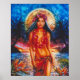 A sensuous goddess of the moon, sunrise, sunset and fertility, Hina rose from the sea and married a mortal. She escapes earthly limitations by living on the moon, periodically returning to visit her husband and teach life enriching arts to her human family. Her companion bird, (flying across over the moon), brings lunar seeds on its feathers to gift the earth with breadfruit trees. Lightning, (lower right hand corner) is the sound of Hina shaking and folding the celestial cloth she weaves. In the "Ascended Masters Oracle Cards", Hina symbolises walking away from restrictions and leaving a situation one has outgrown. Hina embodies the balance between love and freedom.
