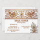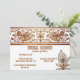 A beautiful dark gold henna and peacock inspired decorative border hugs the top edge of this invitation and a single ornate peacock feather embelishment appears at the bottom right corner. The flourish swirls appear to shimme and shine and look to be 3 dimensional. Golden coloured text templates appear on a stark white background for your custom wording. This is ideal for a muslim, Hindi, traditional Indian or Henna inspired bridal shower; "save the date"; wedding, anniversary or corporate event.