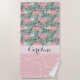 Enjoy total comfort at the beach or sitting poolside, and cool and dry off with this fun, colourful and comfy beach towel. Stand out in the sand with this beautiful contemporary pastel pink flamingos on green palm leafs on light aqua turquoise and pale blue watercolor paint brush strokes pattern. With room to customise or personalise with name, monogram or initials of your choice. Ornate, funky, modern and whimsical design for the artistic fashionista or artsy fashion diva, hip trendsetter, vintage retro watercolor painting art style or abstract motif lover.