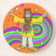 Sixties style hippie with his long hair, sandles, and dyed shirt. He has a beard and a head band and is holding both hand up to show the peace sign. Swirling colours are behind him and stars and other shapes swirl above.