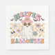 Cute, colourful, fun Hippie Halloween paper napkins features a hippie ghost with pink witch hat, text that reads Hippie Halloween, and some flowers and little bats and skulls in lavender, melon, aqua, and pink!