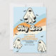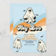 Spooky vibes! Retro groovy Ghost Halloween birthday party invitation in blue and orange. Spooktacular birthday bash invite with retro ghost and bats.