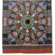 An intricate, hippie Boho inspired mixed pattern design featuring a colourful, earthy kaleidoscope Mandala bordered on the bottom by stripes in complimentary colours of golden yellow, eggplant purple and cinnamon rust brown. The coloured banners have a graphic digital burlap texture pattern in them.