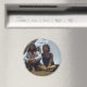 The artist and his mother sit in front of his tipi on this round magnet.