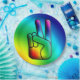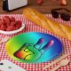 A graphic design of a rainbow peace sign sign by artist/designer Charmaine Paulson on a party plate.