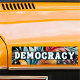 Show your support for democracy with this cool bumper sticker. The design features the word 'Democracy' in groovy lettering, divided into three lines. The background is a colourful abstract flourish with a leafy appearance.