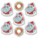 Set of seven cut-vinyl stickers with an illustration of a happy smiling hippopotamus with a Santa Claus hat, on a red background; five stickers of the hippo and two stickers with a Christmas wreath; with a customisable text template for your name or message