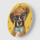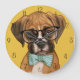 Cute illustration of a hipster style boxer puppy wearing eye glasses and chevron pattern bow tie on bright yellow background. Designed by Maryline Cazenave.