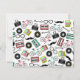 Flat note cards featuring a hipster themed design consisting of illustrations of bicycles, glasses, cassette tapes, vinyl records, skeleton keys, moustaches, cameras, and retro antenna television sets.