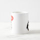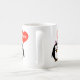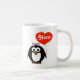 His and hers penguin mugs | matching set. Cute home decor for just married newly weds / husband and wife couple. Romantic gift idea for newlyweds / bride and groom. Also fun for wedding anniversary. Custom background colour behind red heart. Double sided design. Cute animal bird cartoon with red heart balloon.