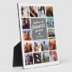 Personalised couple/newlyweds picture plaque featuring a crisp white background that can be changed to any colour, 16 photos of your choice, a grey square with the couples name, a white heart symbol, and the sweet text that reads "together is our favourite place to be".