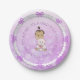 Purple baby shower themed paper plates with little blonde haired Hispanic or African American baby holding a teddy bear.
