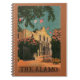 A view of the historic front wall of the Alamo at San Antonio, Texas showing the American flag and the state flag of Texas flying high with large flower bushes that are only a small part of the sprawling gardens in front.