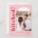 A fun colourful wedding elopement announcement with the headline "hitched!" in magenta bold font and your favourite wedding photo in an arch shape on a light pink background. The reverse is in solid magenta and includes an optional editable message in maggenta.