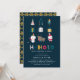 'HO HO HO, We're having a Baby!' Christmas Couples Baby Shower Invitation. Design features a trendy navy blue background with cute little festive illustrations and a customisable template in white text.