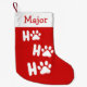Personalise this festive Ho Ho Ho, red and white Christmas stocking for your dog! The custom Ho, Ho, Ho text has dog paw prints for the letter "O" in white. You can change the typeface style for the letter "H", adjust the size of every motif, move elements around, and choose a different background colour. The reverse side of this dog stocking has a red background and white cuff colour block. This fun and unique Christmas stocking is perfect for any dog!