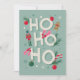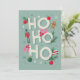 A playful design featuring bold "Ho Ho Ho" text decorated with classic Christmas icons like ornaments, a gingerbread man, candy canes, and pine branches. The colour palette of red, green, and white on a light blue background evokes festive cheer.