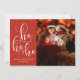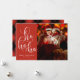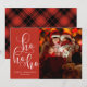 Modern holiday card featuring the words "ho ho ho" in an modern white script handwritten script typography on a red background. Your photo is displayed to the right. Featured on the back is a red and black buffalo plaid pattern.