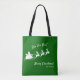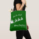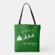 Add a fun seasonal touch to your shopping trip with this custom green and white tote bag. Tote bag features green background with white Merry Christmas greeting and Ho Ho Ho text, your family last name, and Santa Claus flying in his sleigh with reindeer.
