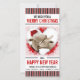 Here's a cute idea for acountry family! A pair of goats all dressed up for the holidays with a santa hat and framed inside a snowflake covered heart frame snuggle and nuzzle eachother lovingly. Bright red and bold black text wishes your friends, family, or customers a Merry Christmas and a happy new year with fun basic san serif block lettering style writing and a customised text area for your names. No frills, modern styling. Classic stripes in black, white and red complete the design top and bottom.