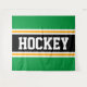 This sporty, athletic design features bold HOCKEY text inside a highlighted wide black stripe with double white and yellow racing stripes against bright green outer stripes. The text in this design can be personalised.
