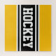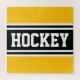 This fun athletic design features bold HOCKEY text inside black and white racing stripes against bright yellow background. The colours and text in this design can be personalised.