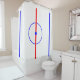 This shower curtain design features a representation of the centre ice and blue lines of an ice hockey arena.