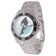 Has heft and feel of expensive stainless steel quartz watches. Good band with safety catch. I removed links, which is easy because engraved arrows show direction to push the linking pins. As always by this seller, the image (a railroad logo) is a perfect reproduction of my emailed image, and is precisely spaced and aligned.