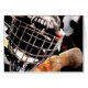 A cool design featuring hockey gear! Hockey mask, hockey stick and puck, and hockey pads in the background, done up in a grunge style effect.