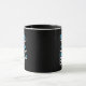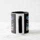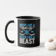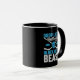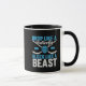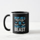 Hockey Goalie mug with blue and white text, helmet with mask, pucks, and hockey sticks reads Drop Like a Butterfly Block Like a Beast!
