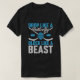 Hockey Goalie T-shirt with blue and white text, helmet with mask, pucks, and hockey sticks reads Drop Like a Butterfly Block Like a Beast!