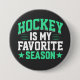 Hockey button with green and white text on a black background reads Hockey is My Favourite Season!