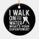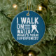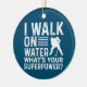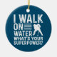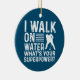 Hockey player ornament with a humorous saying features white text on a blue background and a white silhouette hockey player. The text on this hockey player ornament reads I Walk on Water What's Your Superpower?