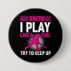 Hockey Play Like a Girl button features a silhouette female hockey player and text reads I Know I Play Like a Girl Try to Keep Up!