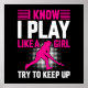 Hockey Play Like a Girl poster features a silhouette female hockey player and text reads I Know I Play Like a Girl Try to Keep Up!