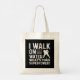 Hockey theme tote bag with white silhouette hockey player with hockey stick and white text that reads I Walk On Water What's Your Superpower?