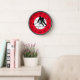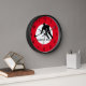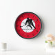 This clock features the silhouette of a hockey player inside a white circle. Around the white circle, there is a red outer ring and black numbers. The text on this clock and the red outer ring can be personalised. The wooden clock frames are available in three colours.