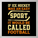 Hockey Versus Football poster features text of yellow and gold and two hockey sticks. This hockey player poster reads If Ice Hockey Was an Easy Sport It Would Be Called Football!