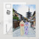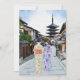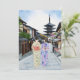 This postcard features a watercolor portrait of two women in kimonos walking down the street infront of Hōkan-Ji Temple in Kyoto.