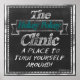 The saying "the hokey pokey clinic, a place to turn yourself around on a blackboard written in chalk with fun fonts and embellishments.